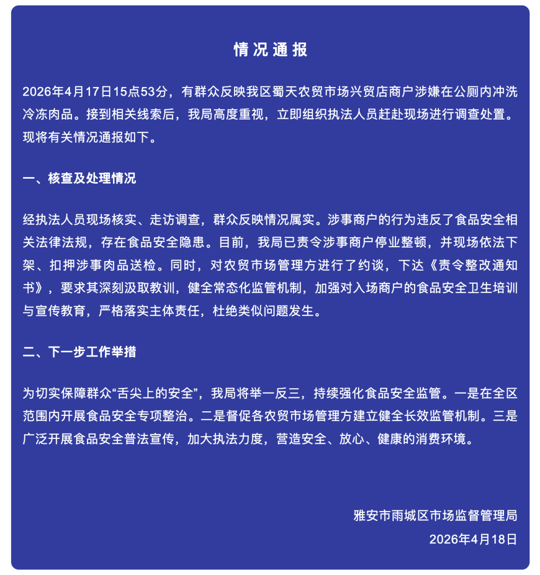 4月18日,四川省雅安市雨城區(qū)市場監(jiān)督管理局發(fā)布情況通報(bào):2026年4月17日15點(diǎn)53分,有群眾反映我區(qū)蜀天農(nóng)貿(mào)市場興貿(mào)店商戶涉嫌在公廁內(nèi)沖洗冷凍肉品。接到相關(guān)線索后,我局高度重視,立即組織執(zhí)法人員趕赴現(xiàn)場進(jìn)行調(diào)查處置?,F(xiàn)將有關(guān)情況通報(bào)如下。一、核查及處理情況經(jīng)執(zhí)法人員現(xiàn)場核實(shí)、走訪調(diào)查,群眾反映情況屬實(shí)。涉事商戶的行為違反了食品安全相關(guān)法律法規(guī),存在食品安全隱患。目前,我局已責(zé)令涉事商戶停業(yè)整頓,并現(xiàn)場依法下架、扣押涉事肉品送檢。同時,對農(nóng)貿(mào)市場管理方進(jìn)行了約談,下達(dá)《責(zé)令整改通知書》,要求其深刻汲取教訓(xùn),健全常態(tài)化監(jiān)管機(jī)制,加強(qiáng)對入場商戶的食品安全衛(wèi)生培訓(xùn)與宣傳教育,嚴(yán)格落實(shí)主體責(zé)任,杜絕類似問題發(fā)生。二、下一步工作舉措為切實(shí)保障群眾“舌尖上的安全”,我局將舉一反三,持續(xù)強(qiáng)化食品安全監(jiān)管。一是在全區(qū)范圍內(nèi)開展食品安全專項(xiàng)整治。二是督促各農(nóng)貿(mào)市場管理方建立健全長效監(jiān)管機(jī)制。三是廣泛開展食品安全普法宣傳,加大執(zhí)法力度,營造安全、放心、健康的消費(fèi)環(huán)境。