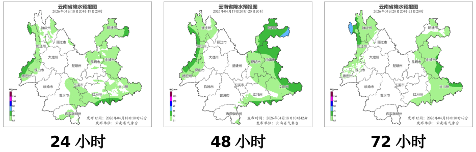 昭通市、曲靖市北部和東部、文山州東部、怒江州西部、保山市西部、德宏州西部陰有中雨局部大雨,曲靖市西南部、文山州西部、昆明市、紅河州東北部和南部、迪慶州、怒江州東部、保山市中部、德宏州中部多云有陣雨局部中雨,其他地區晴間多云。