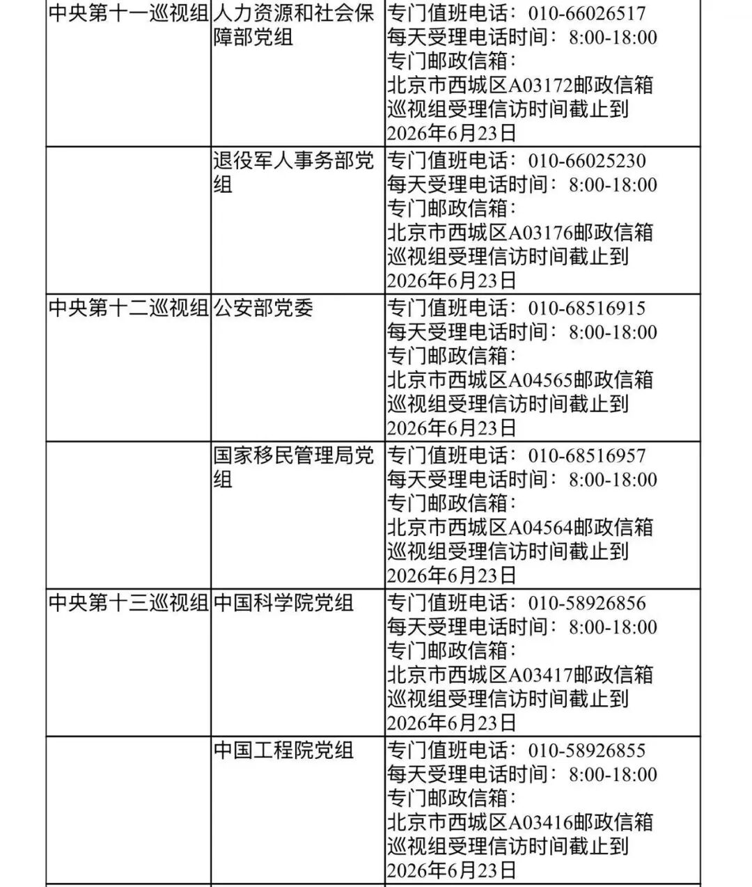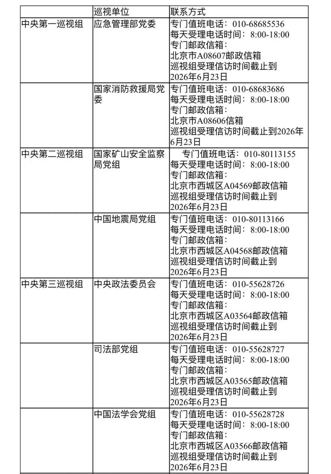 據悉,巡視期間設立專門值班電話和郵政信箱,主要受理反映被巡視黨組織領導班子及其成員、下一級黨組織主要負責人問題的來信來電來訪,重點是關于違反政治紀律、組織紀律、廉潔紀律、群眾紀律、工作紀律、生活紀律等方面的舉報和反映。巡視組受理信訪時間截止到2026年6月23日。