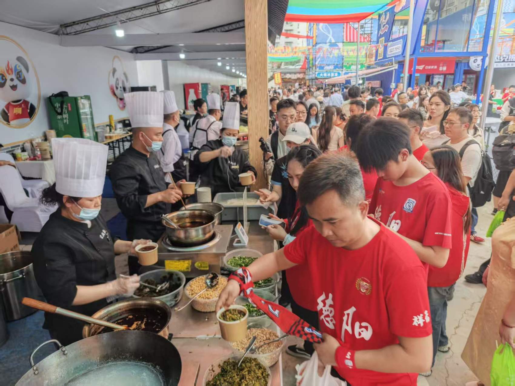 “自從川超開賽,我們每天下午4點出攤,一直忙到晚上10點多。賽前一小時全是排隊的球迷,今天的營業額比預期高出三倍!”綿陽米粉攤位主管楊昆介紹。
