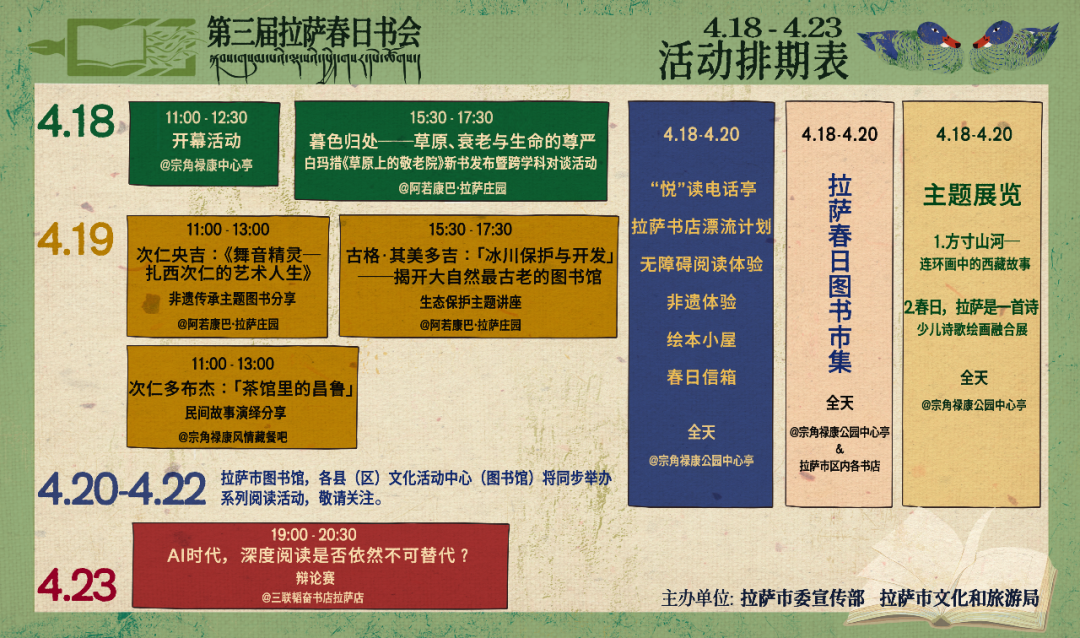 本屆書會各類活動將延續至4月23日,期間將舉辦新書簽售活動、非遺傳承主題講座、生態保護主題講座等多元主題活動,并在4月23日“世界讀書日”當晚,在三聯韜奮書店拉薩店上演本屆書會收官之作——“AI時代,深度閱讀是否依然不可替代?”主題辯論賽,以開放性思辨回應時代之問。