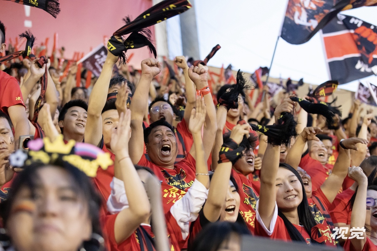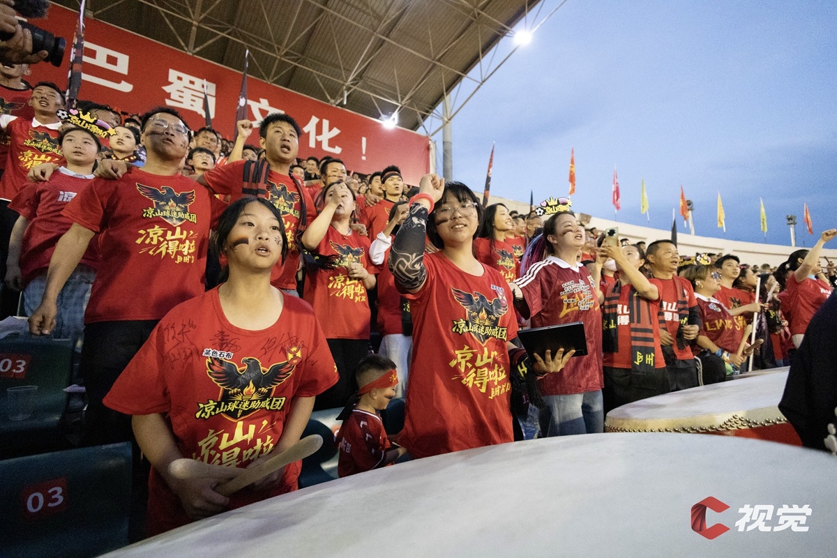 4月18日晚,“川超”決賽階段第六輪開啟,涼山好醫生隊主場3:2戰勝成都錦城隊。圖為看臺上的涼山球迷激動歡呼。C視覺簽約攝影師 拉薩