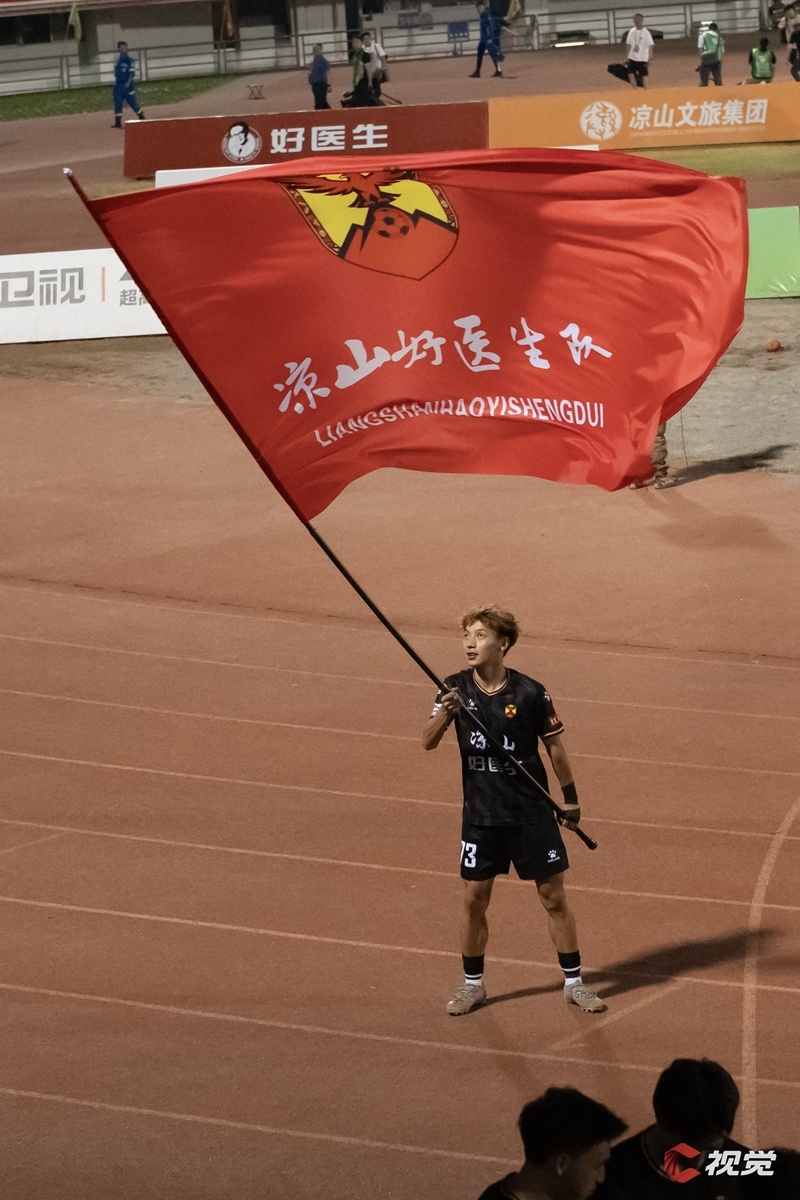 4月18日晚,“川超”決賽階段第六輪開啟,涼山好醫生隊主場3:2戰勝成都錦城隊。圖為涼山隊球員揮舞隊旗。C視覺簽約攝影師 拉薩