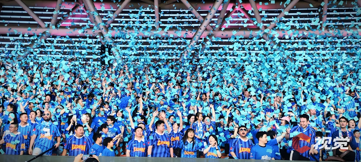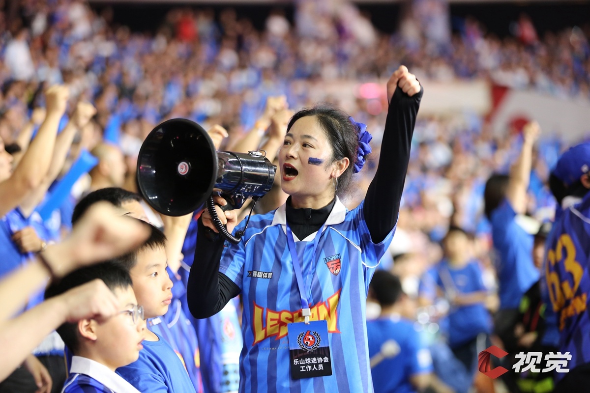 4月18日晚,“川超”決賽階段第六輪開啟,樂山味道非常隊坐鎮主場,迎戰宜賓長江首城隊。圖為樂山球迷為主隊助威。C視覺簽約攝影師 蔣勝