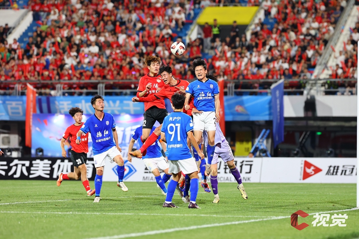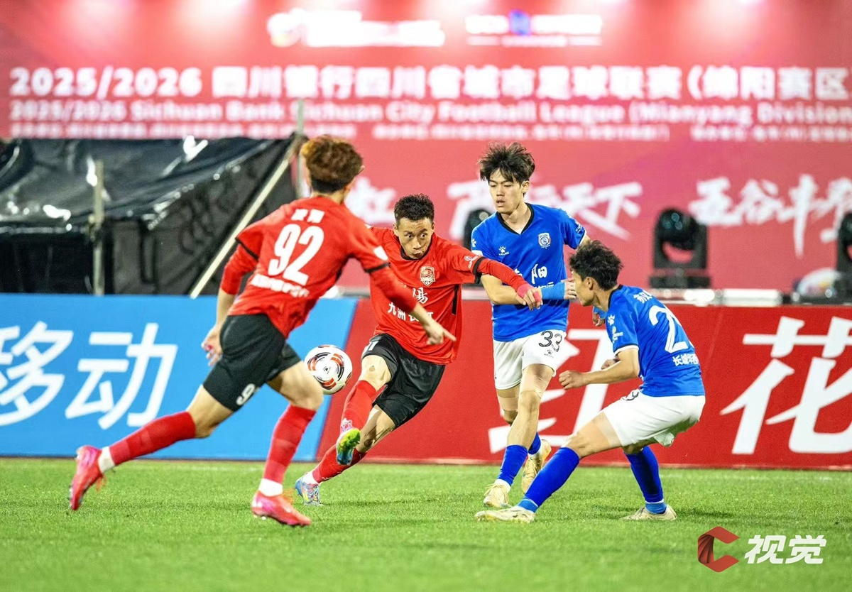 4月18日晚,“川超”決賽階段第六輪開啟,綿陽九洲長虹隊主場3:1擊敗德陽重裝隊。圖為兩隊隊員激烈拼搶。C視覺簽約攝影師 鐘歡