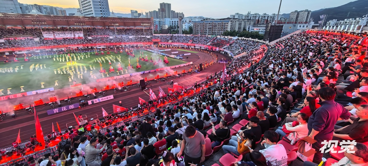 4月18日晚,“川超”決賽階段第六輪開啟,達州川漢子隊主場迎戰自貢燈城燊龍隊。圖為賽前文藝表演。C視覺簽約攝影師 王新