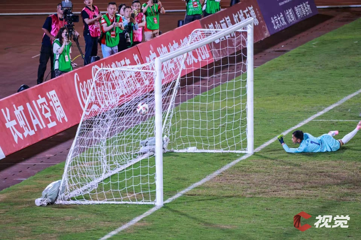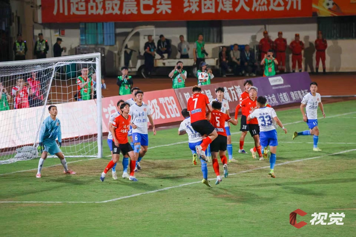 4月18日晚,“川超”決賽階段第六輪開啟,達州川漢子隊主場4:2戰勝自貢燈城燊龍隊。圖為達州隊進球瞬間。C視覺簽約攝影師 王新