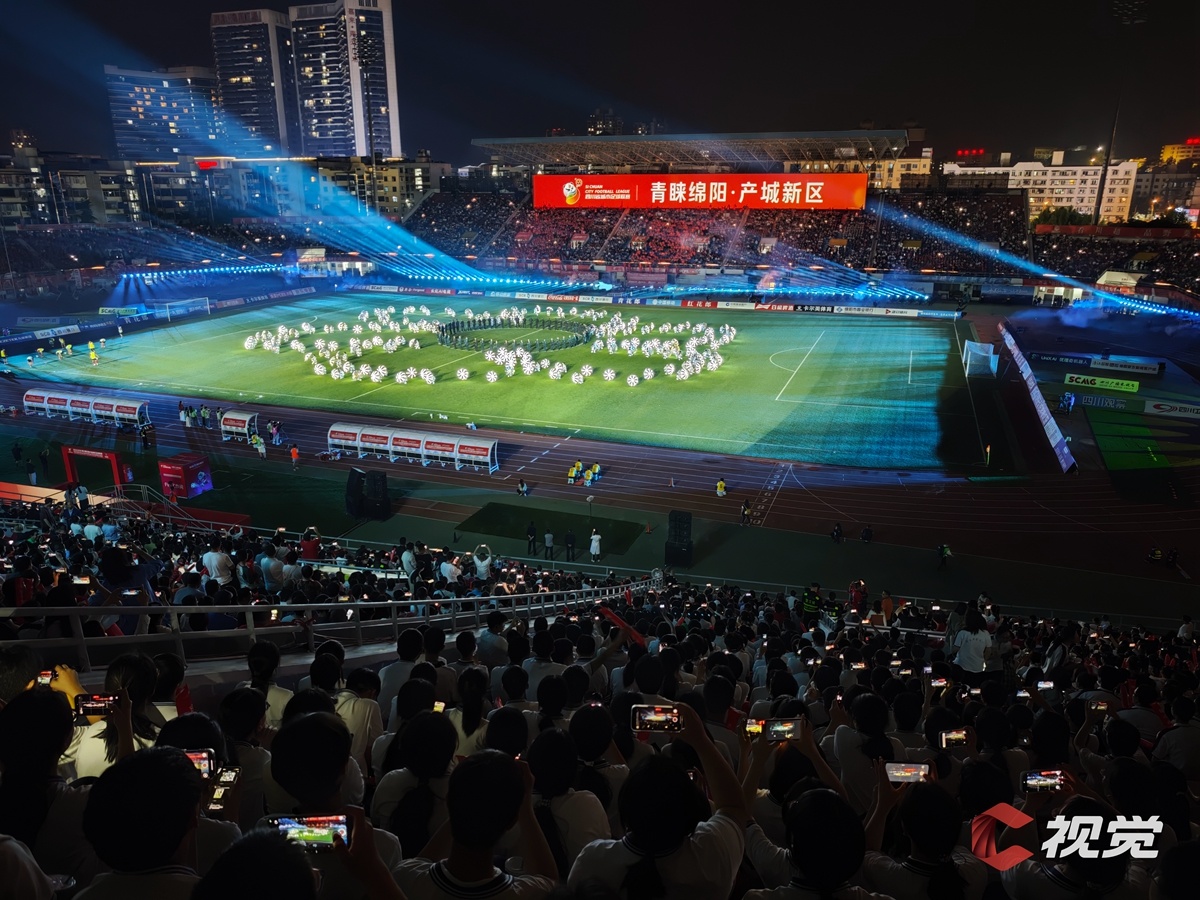4月18日晚,“川超”決賽階段第六輪開啟,綿陽九洲長虹隊主場迎戰德陽重裝隊。圖為現場觀眾觀看、拍攝比賽中場演出。C視覺簽約攝影師 杜康