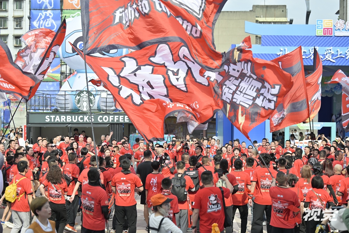 4月18日晚,“川超”決賽階段第六輪開啟,綿陽九洲長虹隊主場迎戰德陽重裝隊。賽前,綿陽球迷在場外搖旗助威。C視覺簽約攝影師 杜康