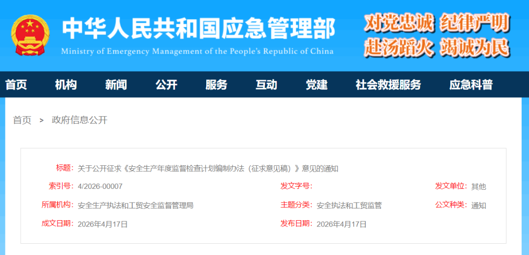 為深入推進嚴格精準規范執法,應急管理部執法工貿局組織對《安全生產年度監督檢查計劃編制辦法》進行了修訂,形成了征求意見稿(見附件1)。現向社會公開征求意見,反饋意見請填寫《征求意見表》(見附件3),并發送至郵箱aqscfzjs@163.com,截止時間為2026年5月16日。