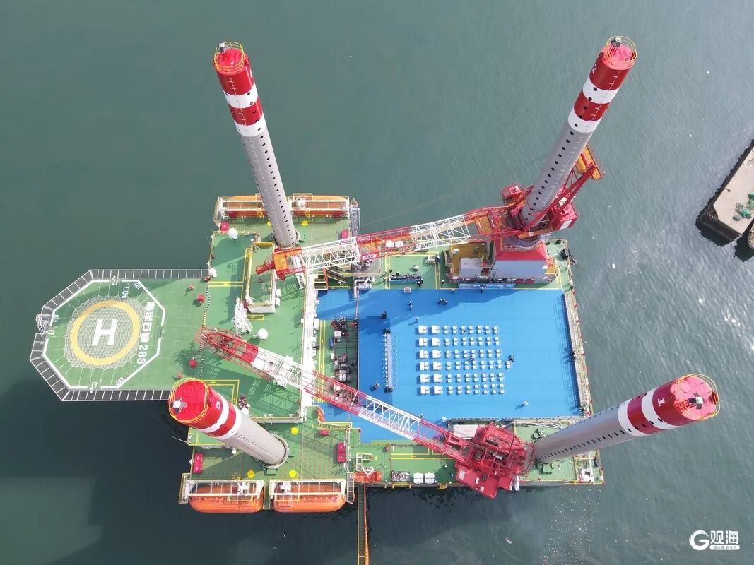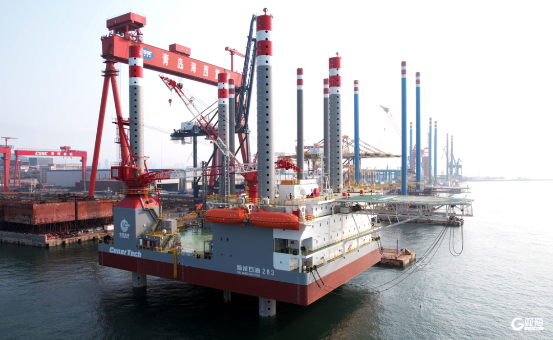 4月18日,中船武漢船機海西重機承建的我國首座海上移動式多功能措施平臺“海洋石油283”在青島海西灣命名交付。